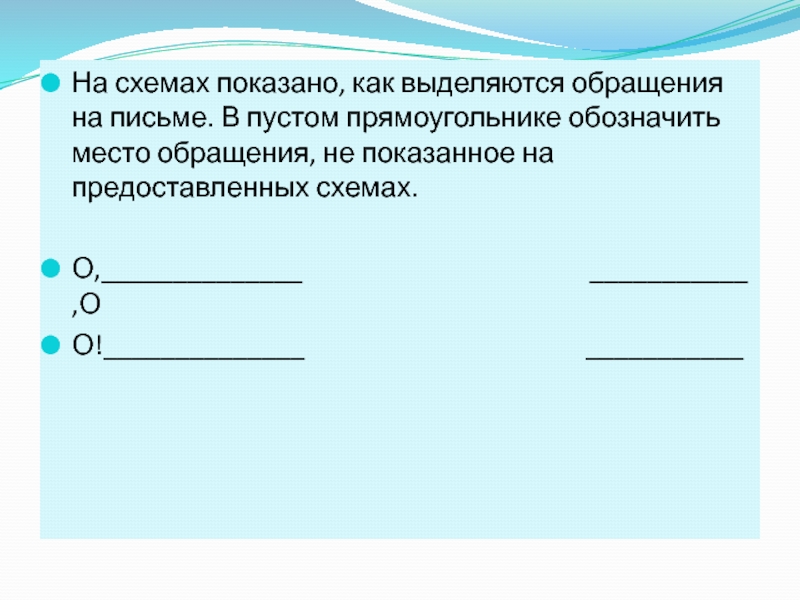 Слайд 19На схемах показано, как выделяются обращения на письме. В пустом