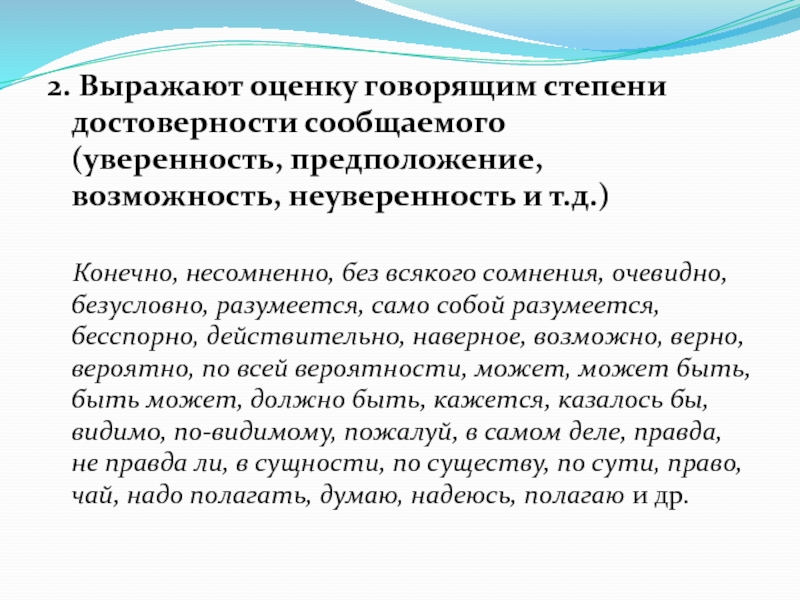 2. Выражают оценку говорящим степени достоверности сообщаемого