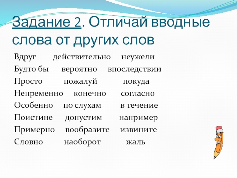 довершение, вдруг, ведь, в конечном счёте, вот, вряд ли, всё-таки, даже, едва ли, исключительно, именно, иногда, как будто, как бы, как раз, между тем, небось, никак, поистине, почти, поэтому, приблизительно, примерно, притом, причём, просто, решительно, словно, тем не менее, якобы и др. подобные (частицы, наречия).