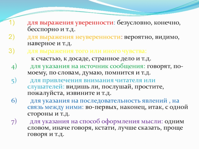 общем, в частности, прежде всего, кроме того, сверх того, стало быть, например, к примеру, главное, таким образом, кстати, кстати сказать, к слову сказать, во-первых, во-вторых и т. д., с одной стороны, с другой стороны, повторяю, подчёркиваю и др.
