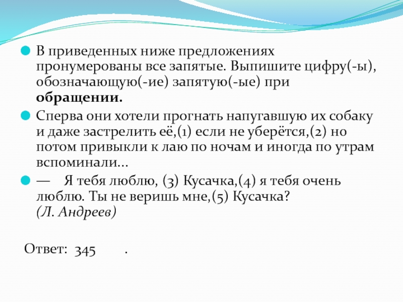 — Я тебя люблю, (3) Кусачка,(4) я тебя очень люблю. Ты не веришь мне,(5) Кусачка? (Л. Андреев)