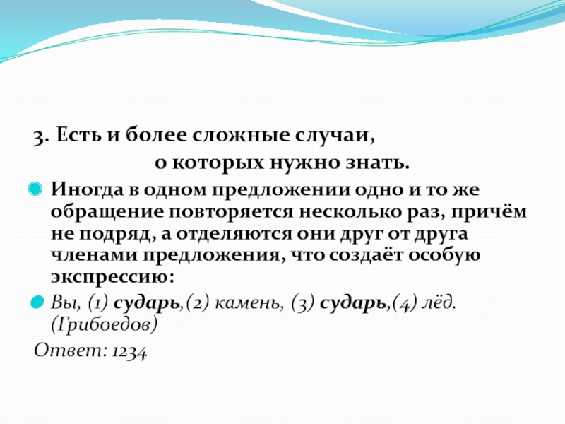 Вы, (1) сударь,(2) камень, (3) сударь,(4) лёд. (Грибоедов)