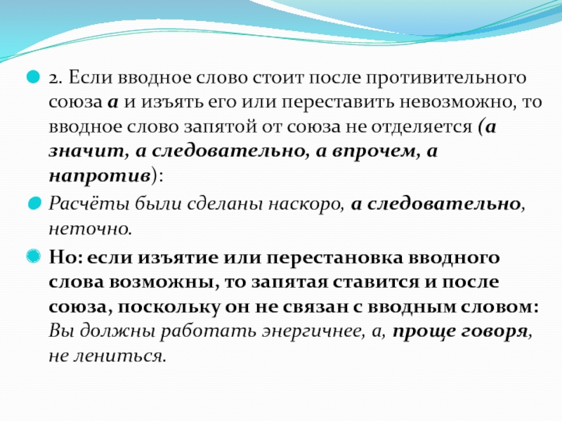 Но: если изъятие или перестановка вводного слова возможны, то запятая ставится и после союза, поскольку он не связан с вводным словом: Вы должны работать энергичнее, а, проще говоря, не лениться.