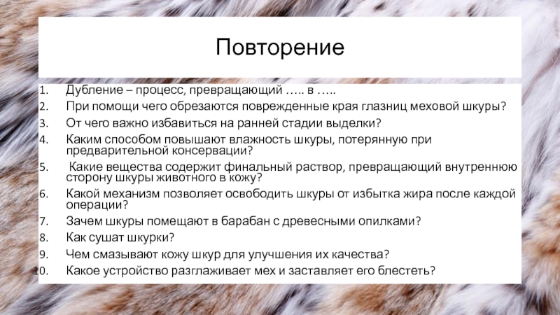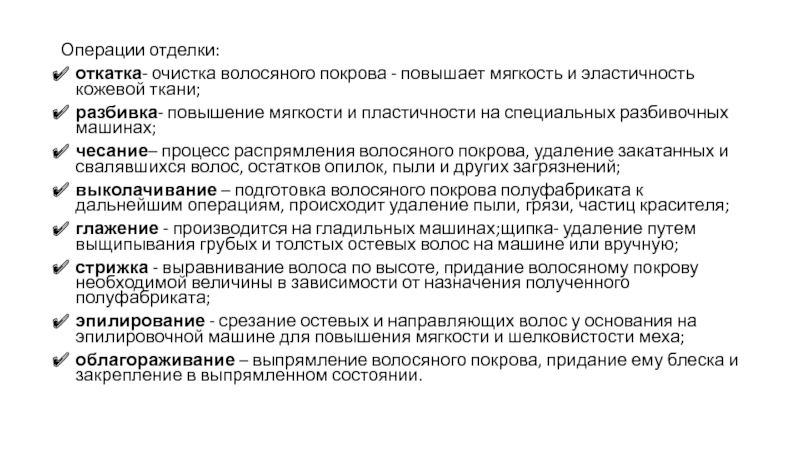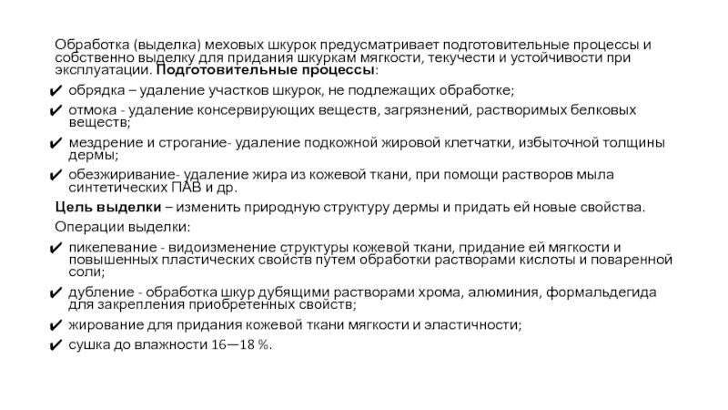 Слайд 8Обработка (выделка) меховых шкурок предусматривает подготовительные процессы и собственно выделку