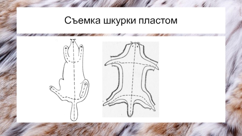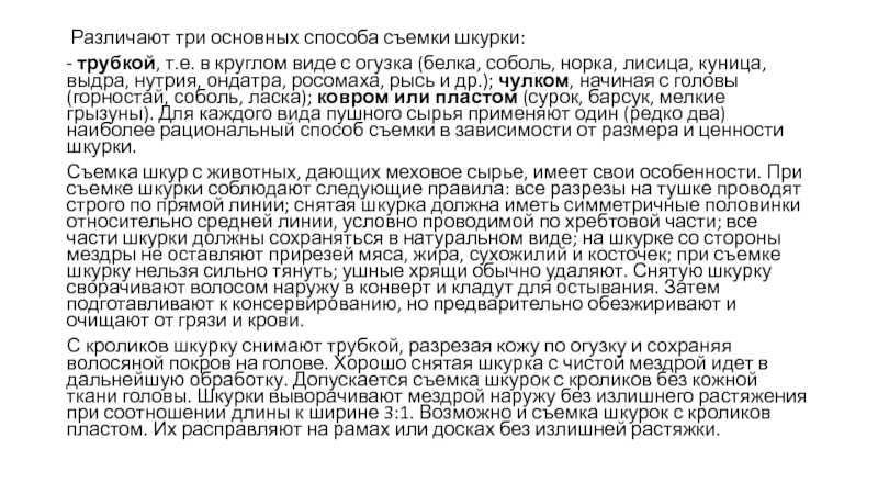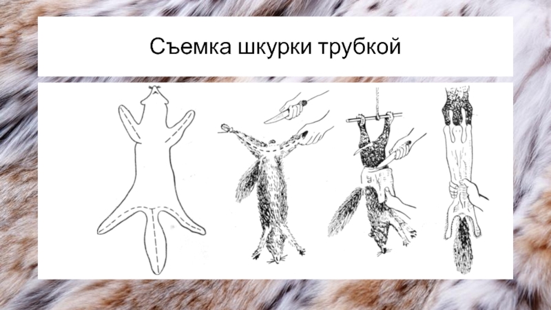 нутрия, ондатра, росомаха, рысь и др.); чулком, начиная с головы (горностай, соболь, ласка); ковром или пластом (сурок, барсук, мелкие грызуны). Для каждого вида пушного сырья применяют один (редко два) наиболее рациональный способ съемки в зависимости от размера и ценности шкурки.