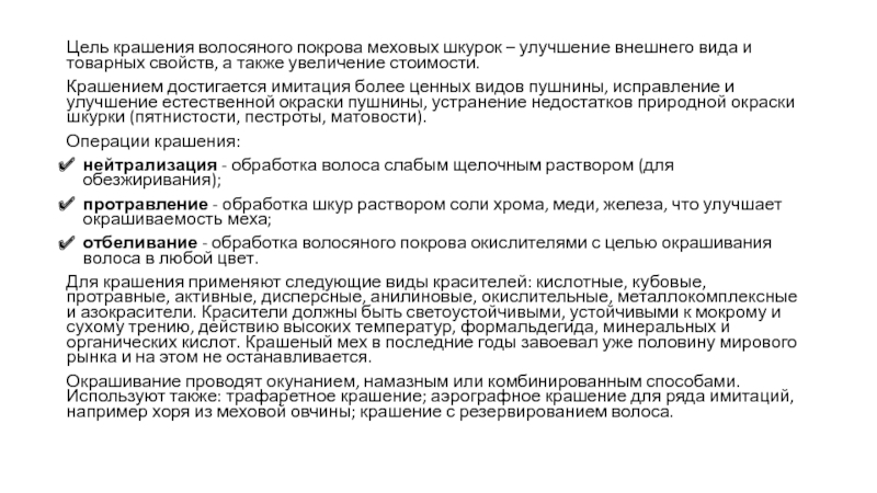 Слайд 10Цель крашения волосяного покрова меховых шкурок – улучшение внешнего вида