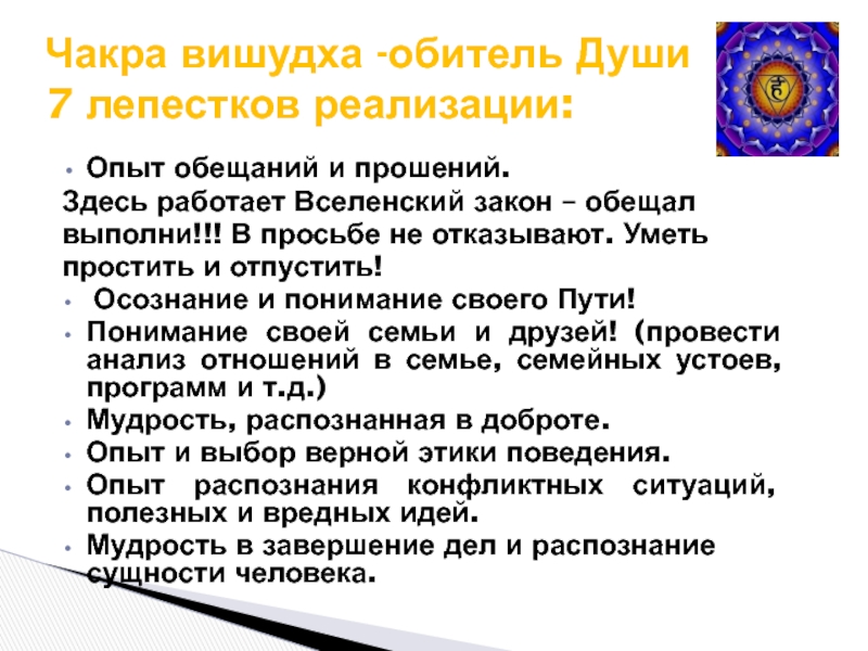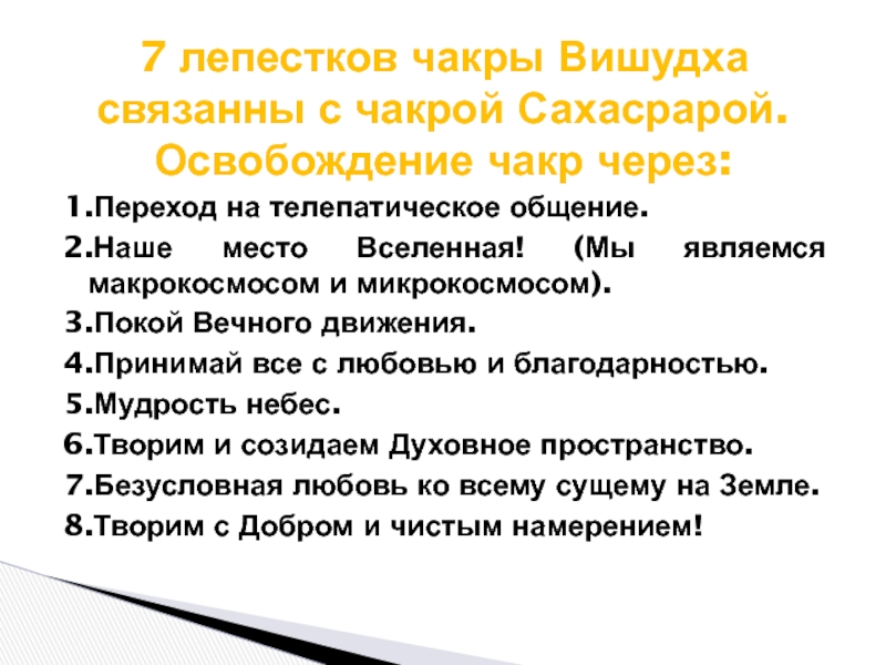 7 лепестков чакры Вишудха связанны с чакрой Сахасрарой. Освобождение чакр через: