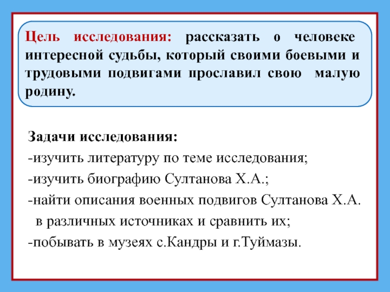 Цель исследования: рассказать о человеке интересной судьбы, который своими боевыми и трудовыми подвигами прославил свою малую родину.Задачи