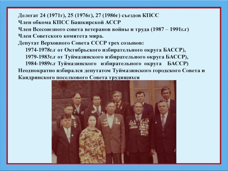 Слайд 21Делегат 24 (1971г), 25 (1976г), 27 (1986г) съездов КПСС