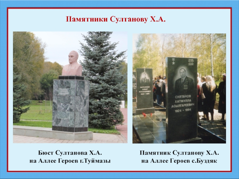 Памятники Султанову Х.А.Бюст Султанова Х.А. на Аллее Героев г.ТуймазыПамятник Султанову Х.А. на Аллее Героев с.Буздяк