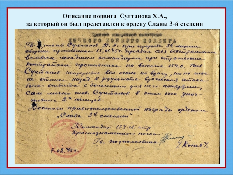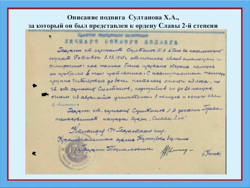Описание подвига Султанова Х.А., за который он был представлен к ордену Славы 2-й степени