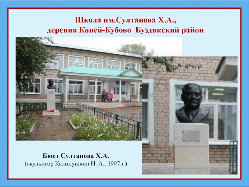 Школа им.Султанова Х.А.,деревня Копей-Кубово Буздякский районБюст Султанова Х.А. (скульптор Калинушкин Н. А., 1997 г.)