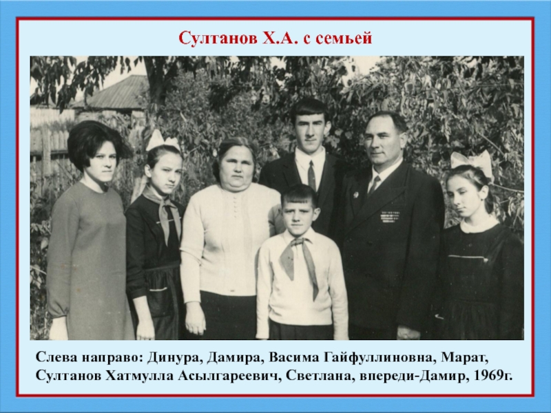 Слева направо: Динура, Дамира, Васима Гайфуллиновна, Марат,Султанов Хатмулла Асылгареевич, Светлана, впереди-Дамир, 1969г.Султанов Х.А. с семьей