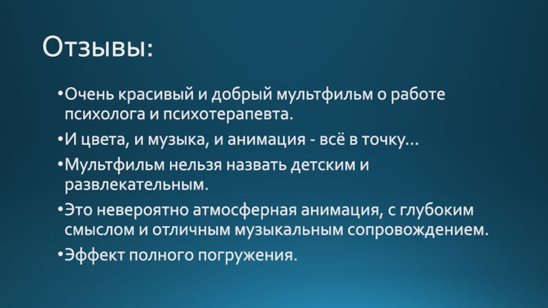 Отзывы: Очень красивый и добрый мультфильм о работе психолога и психотерапевта.И цвета, и музыка, и анимация -