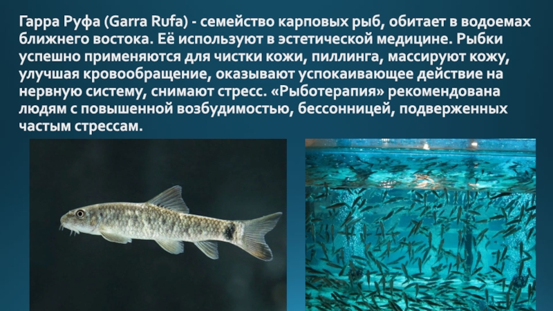 Слайд 8Гарра Руфа (Garra Rufa) - семейство карповых рыб, обитает в
