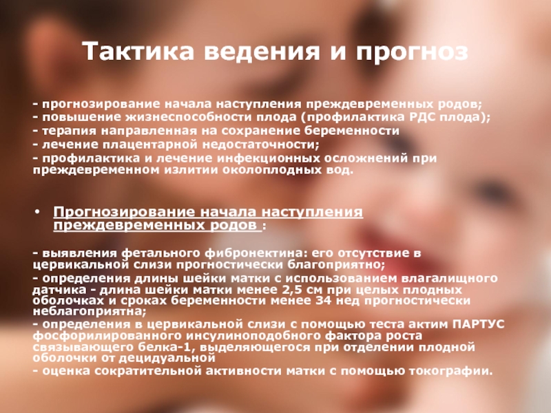 - определения в цервикальной слизи с помощью теста актим ПАРТУС фосфорилированного инсулиноподобного фактора роста связывающего белка-1, выделяющегося при отделении плодной оболочки от децидуальной