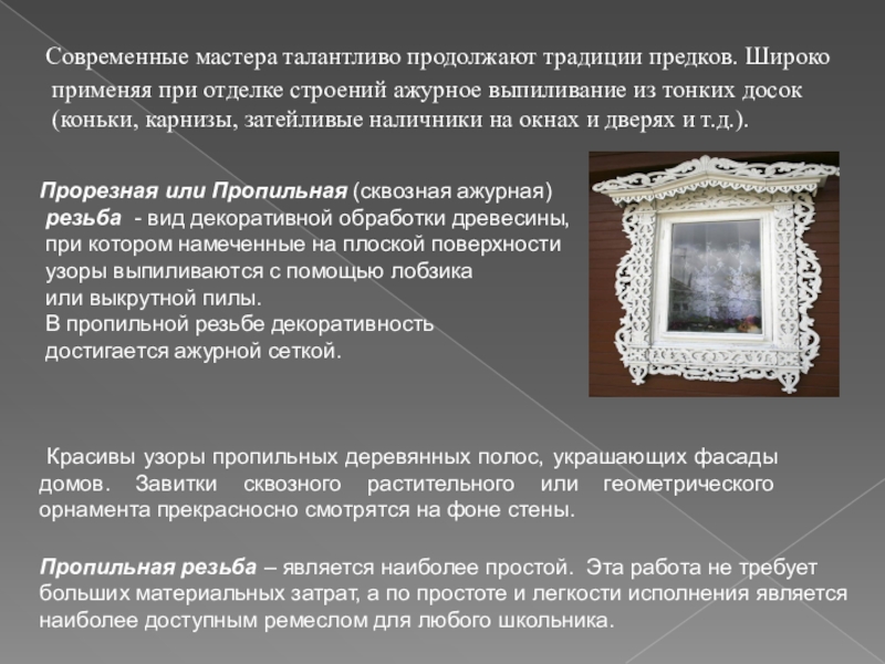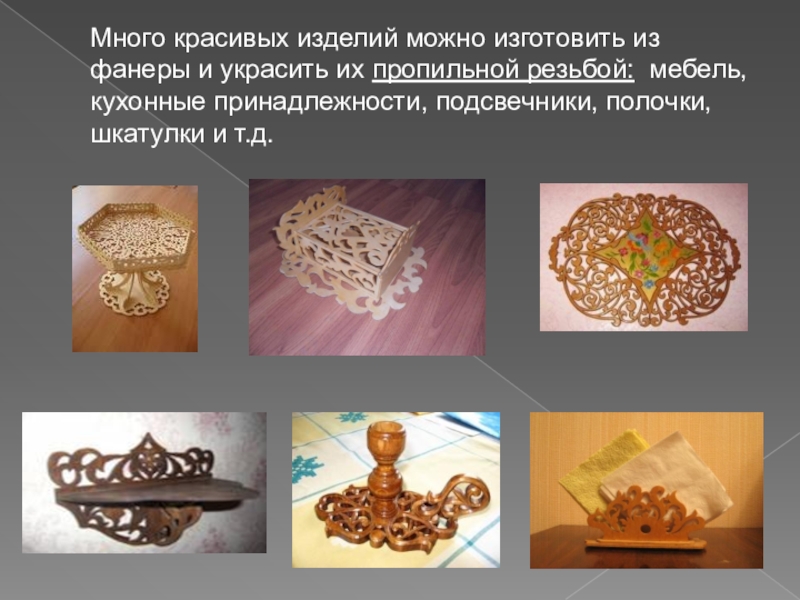 Пропильная резьба – является наиболее простой. Эта работа не требует больших материальных затрат, а по простоте и легкости исполнения является наиболее доступным ремеслом для любого школьника.