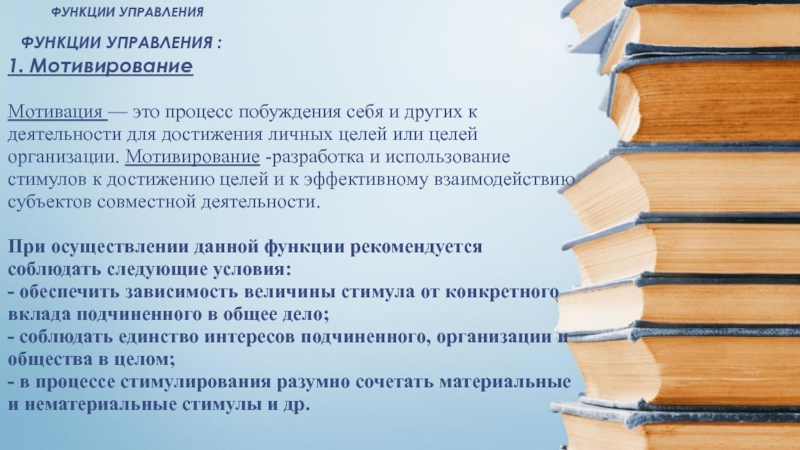 Мотивирование -разработка и использование стимулов к достижению целей и к эффективному взаимодействию субъектов совместной деятельности.