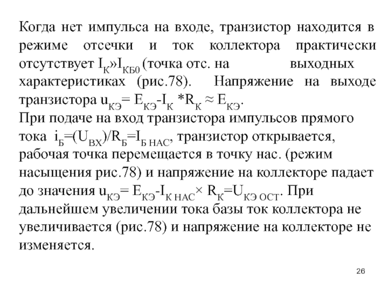При подаче на вход транзистора импульсов прямого тока iБ=(UВХ)/RБ=IБ НАС, транзистор открывается, рабочая точка перемещается в точку нас. (режим насыщения рис.78) и напряжение на коллекторе падает до значения uКЭ= ЕКЭ-IК НАС× RК=UКЭ ОСТ. При дальнейшем увеличении тока базы ток коллектора не увеличивается (рис.78) и напряжение на коллекторе не изменяется.