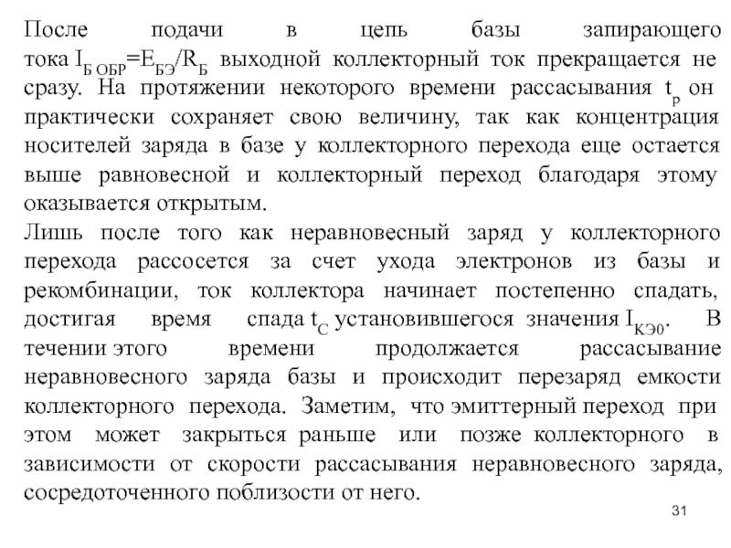 Слайд 31После подачи в цепь базы запирающего тока IБ ОБР=EБЭ/RБ выходной коллекторный ток прекращается