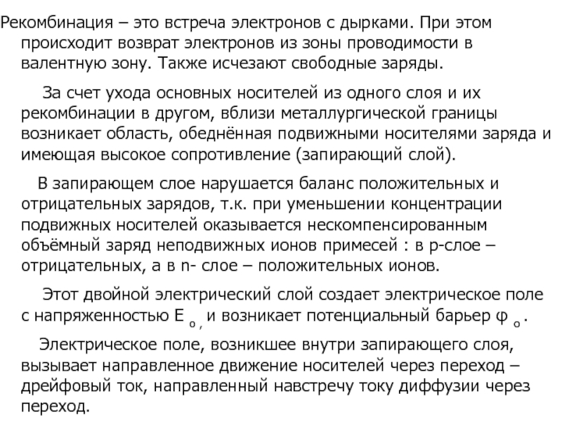 Электрическое поле, возникшее внутри запирающего слоя, вызывает направленное движение носителей через переход – дрейфовый ток, направленный навстречу току диффузии через переход.