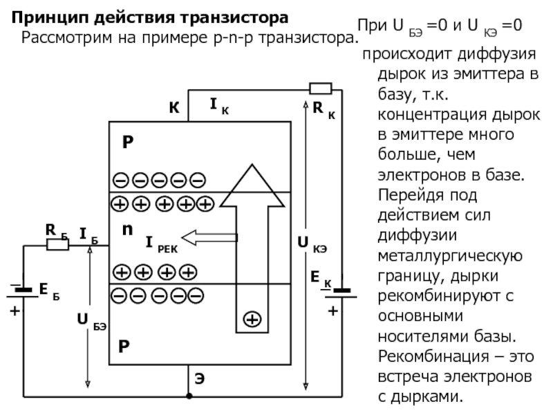 Т.к. небольшая часть дырок из эмиттера всё же рекомбинирует с электронами в базе, нейтральность базы нарушится и для её восстановления из внешней цепи за счет U БЭ будут поступать электроны.