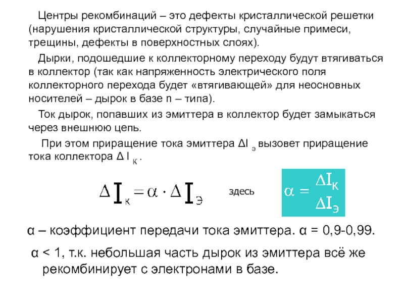 α < 1, т.к. небольшая часть дырок из эмиттера всё же рекомбинирует с электронами в базе.