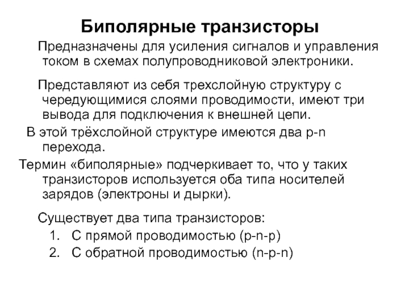 Термин «биполярные» подчеркивает то, что у таких транзисторов используется оба типа носителей зарядов (электроны и дырки).