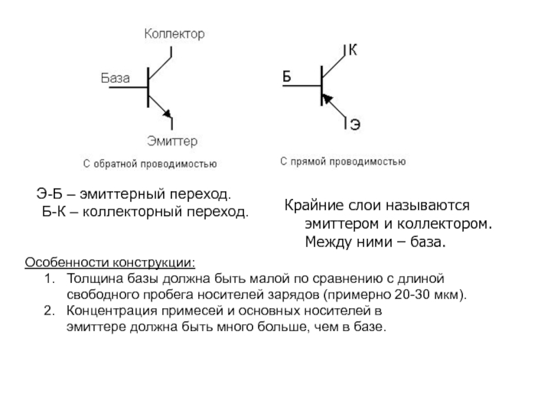 Крайние слои называются эмиттером и коллектором. Между ними – база.