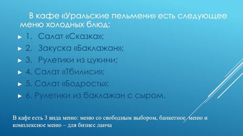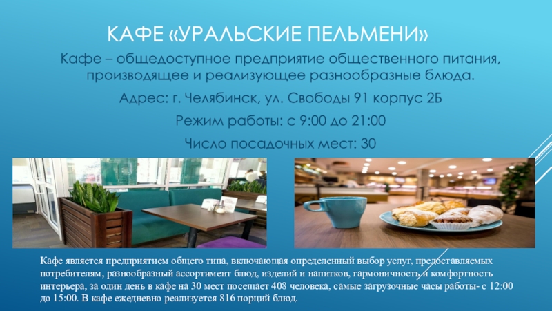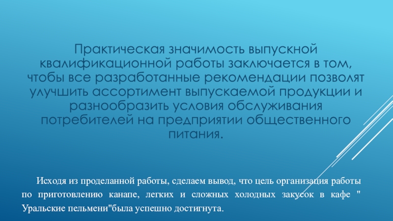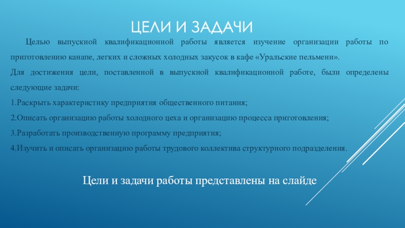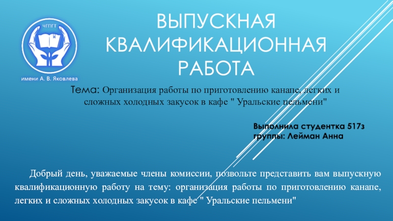 группы: Лейман АннаДобрый день, уважаемые члены комиссии, позвольте представить вам выпускную квалификационную работу на тему: организация работы по приготовлению канапе, легких и сложных холодных закусок в кафе " Уральские пельмени"