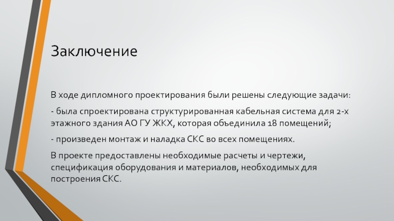 В проекте предоставлены необходимые расчеты и чертежи, спецификация оборудования и материалов, необходимых для построения СКС.