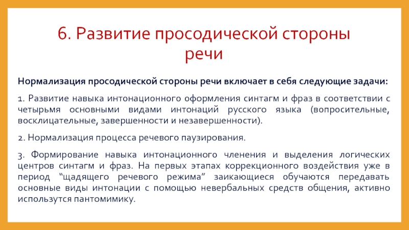3. Формирование навыка интонационного членения и выделения логических центров синтагм и фраз. На первых этапах коррекционного воздействия уже в период “щадящего речевого режима” заикающиеся обучаются передавать основные виды интонации с помощью невербальных средств общения, активно использутся пантомимику.