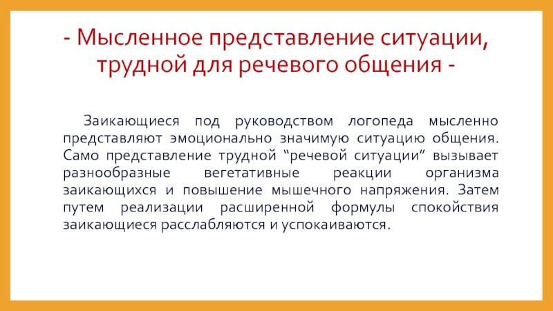 представление трудной “речевой ситуации” вызывает разнообразные вегетативные реакции организма заикающихся и повышение мышечного напряжения. Затем путем реализации расширенной формулы спокойствия заикающиеся расслабляются и успокаиваются.