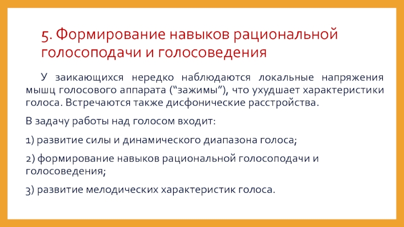 5. Формирование навыков рациональной голосоподачи и голосоведения.