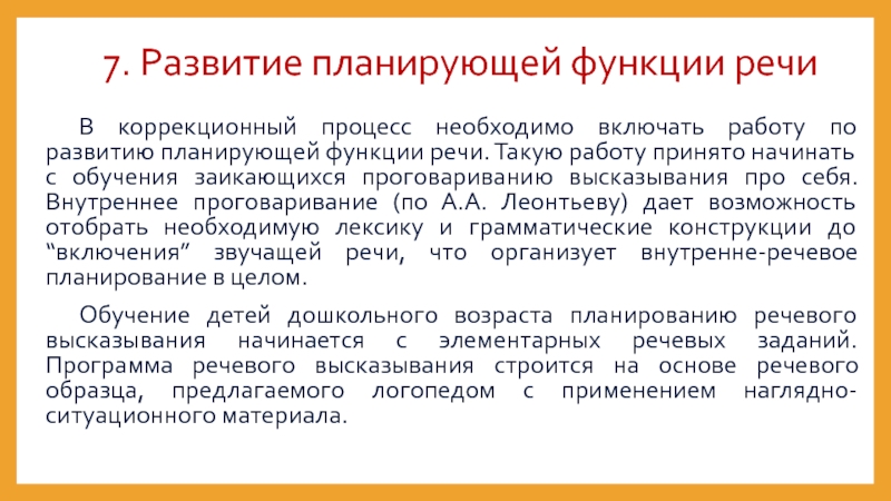обучения заикающихся проговариванию высказывания про себя. Внутреннее проговаривание (по А.А. Леонтьеву) дает возможность отобрать необходимую лексику и грамматические конструкции до “включения” звучащей речи, что организует внутренне-речевое планирование в целом.