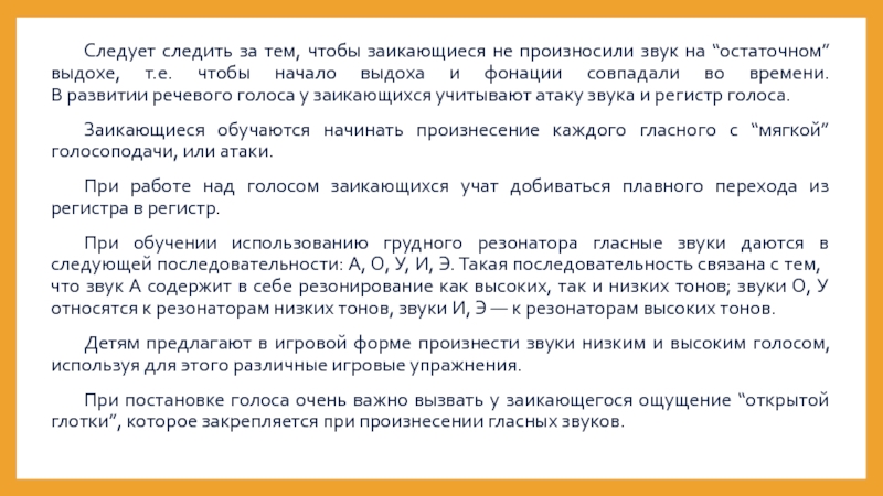 При постановке голоса очень важно вызвать у заикающегося ощущение “открытой глотки”, которое закрепляется при произнесении гласных звуков.