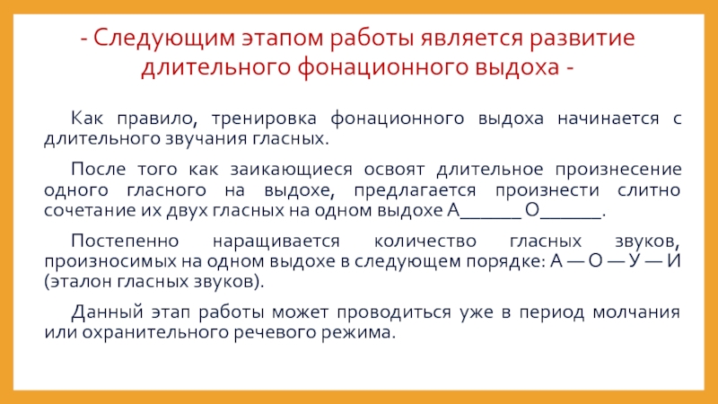 Слайд 22- Следующим этапом работы является развитие длительного фонационного выдоха -