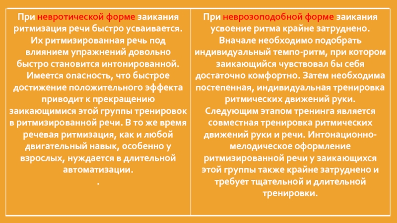 У заикающихся имеются нарушения речевых ритмов разных уровней: послогового, пословного и синтагматического. При обучении заикающихся ритмизации устной речи необходимо тщательно отбирать речевой материал.