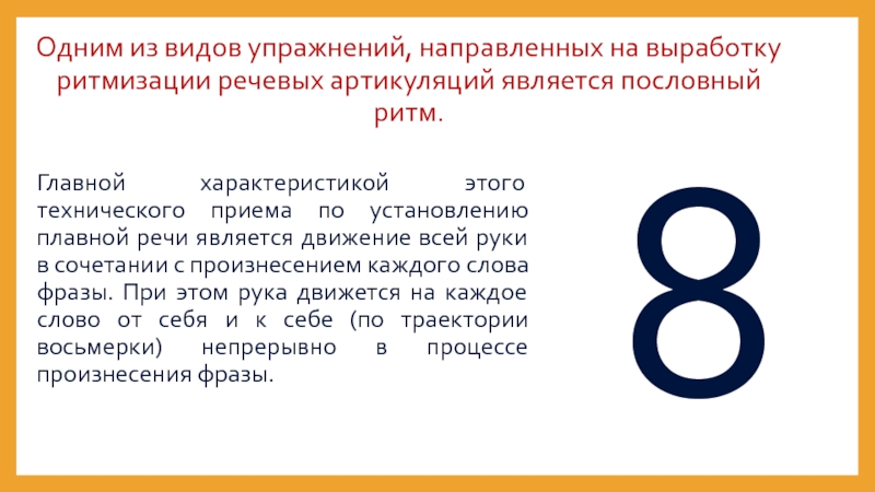 речи является движение всей руки в сочетании с произнесением каждого слова фразы. При этом рука движется на каждое слово от себя и к себе (по траектории восьмерки) непрерывно в процессе произнесения фразы.