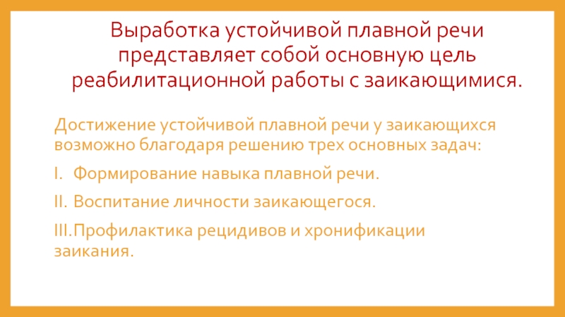 Слайд 2Выработка устойчивой плавной речи представляет собой основную цель реабилитационной работы