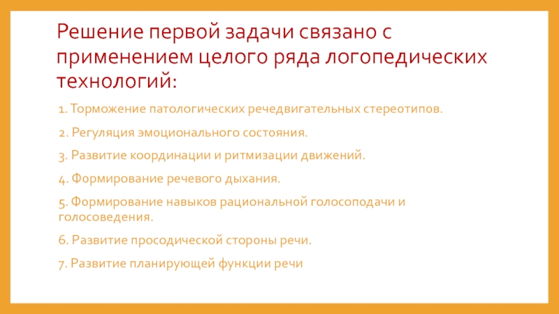 Слайд 3Решение первой задачи связано с применением целого ряда логопедических технологий: