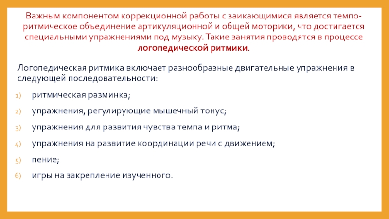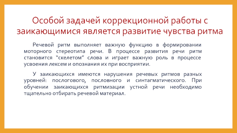 Слайд 15Особой задачей коррекционной работы с заикающимися является развитие чувства ритма