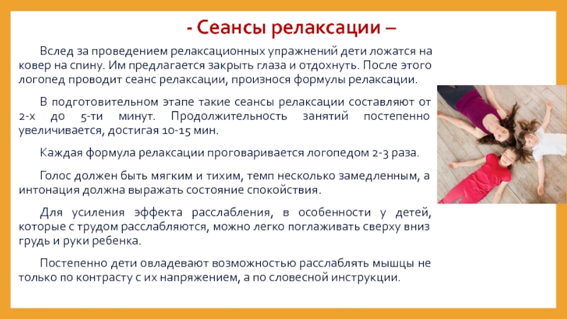 отдохнуть. После этого логопед проводит сеанс релаксации, произнося формулы релаксации.