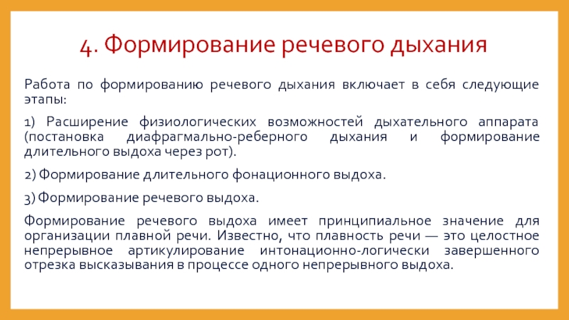 Формирование речевого выдоха имеет принципиальное значение для организации плавной речи. Известно, что плавность речи — это целостное непрерывное артикулирование интонационно-логически завершенного отрезка высказывания в процессе одного непрерывного выдоха.