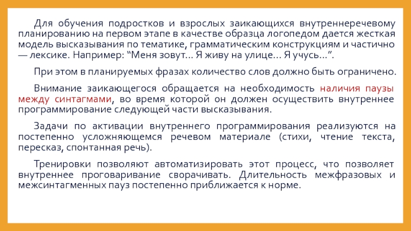 Слайд 30Для обучения подростков и взрослых заикающихся внутреннеречевому планированию на первом
