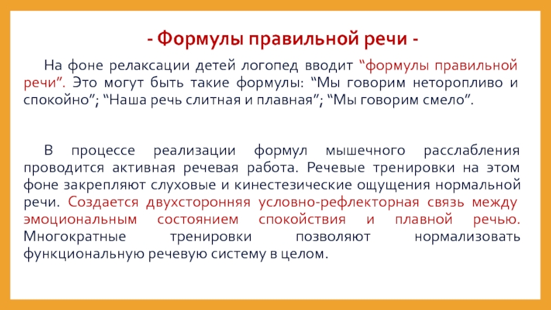 Слайд 8На фоне релаксации детей логопед вводит “формулы правильной речи”. Это