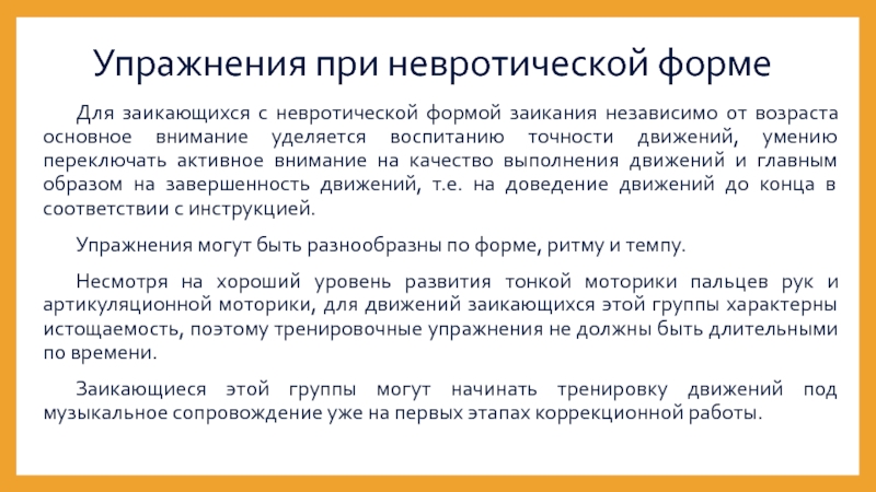 Несмотря на хороший уровень развития тонкой моторики пальцев рук и артикуляционной моторики, для движений заикающихся этой группы характерны истощаемость, поэтому тренировочные упражнения не должны быть длительными по времени.