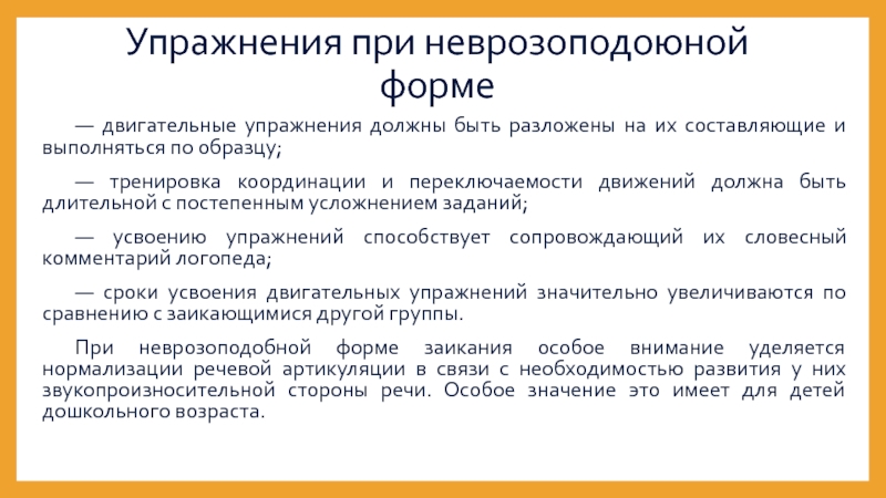 При неврозоподобной форме заикания особое внимание уделяется нормализации речевой артикуляции в связи с необходимостью развития у них звукопроизносительной стороны речи. Особое значение это имеет для детей дошкольного возраста.