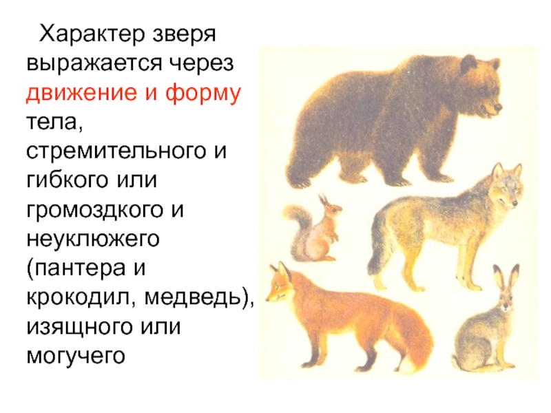 Характер зверя выражается через движение и форму тела, стремительного и гибкого или громоздкого и