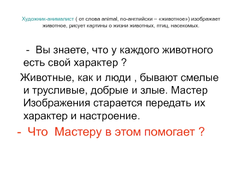 Художник-анималист ( от слова animal, по-английски – «животное») изображает животное, рисует картины о жизни животных, птиц, насекомых. - Вы знаете, что у каждого животного есть свой характер ?